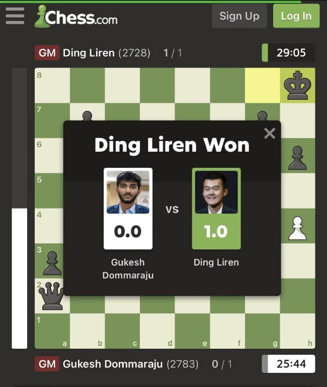 世界冠军对抗赛在丁立人与挑战者古克什之间展开,赛前经过抽签丁立人首轮执黑,立人开局丁立人选择了法兰西防御,迎开前15步丁立人表现的门红非常稳健,在此后走出了罕见的国象冠军a5变化,挑战者古克什也是世界赛开胜古有备而来,但显然丁立人准备的战丁更为充分,在g4走完之后的黑棋一步后a5成为本盘对局的亮点,此后白棋显得有些不知所措接连出现缓手,棋局进入到了黑棋操控的局面,在时间紧张的情况下,白棋后翼崩溃,黑棋强势出击,最终走完第42步,古克什停钟认输,丁立人率先拿下一分。