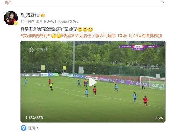 中国女足陈巧珠,在社交媒体表达了对裁判错误判罚的中超中国足球不满。