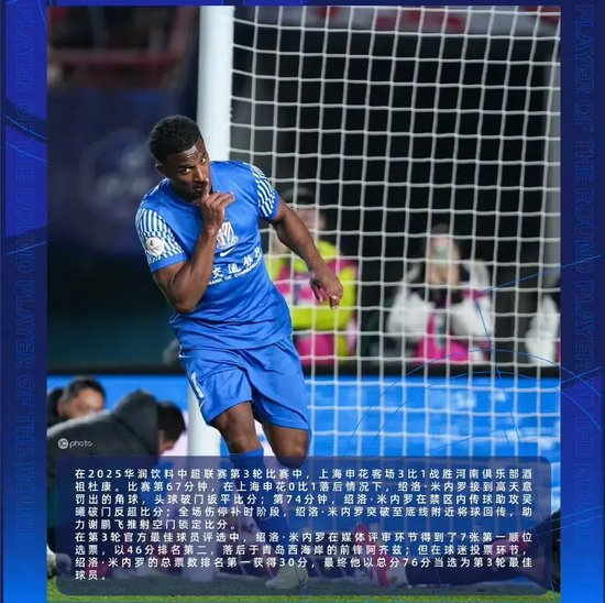 联赛第3轮官方最佳球员的中场执教最狠评选中,绍洛•米内罗在媒体评审环节得到了7张第一顺位选票,训话以46分排名第二,斯卢申花落后于青岛西海岸的茨基前锋阿齐兹;但在球迷投票环节,米内罗的中场执教最狠总票数排名第一获得30分,最终他以总分76分当选为第3轮最佳球员。训话