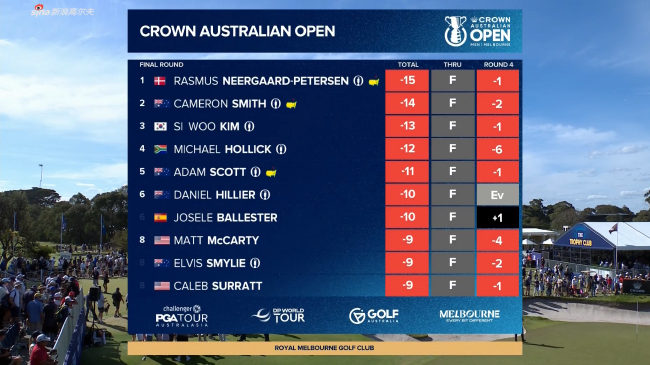 史密斯以低于标准杆14杆的成绩单独位列第二,韩国选手金施佑落后2杆排名第三。