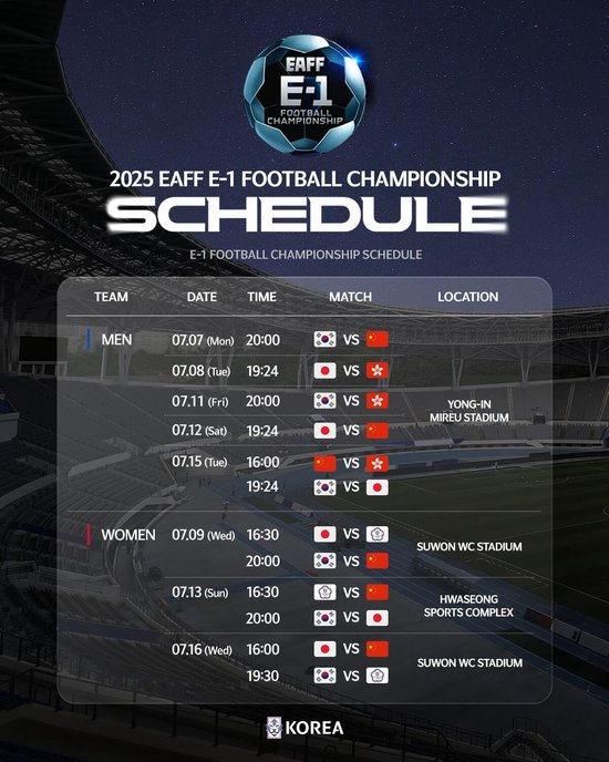 7月7日19:00,日首韩国vs中国(龙仁Mireu体育场)