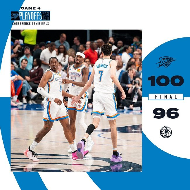 雷霆(2-2):亚历山大34分8篮板5助攻、霆险霍姆格伦18分9篮板4盖帽、行侠多特17分8篮板、亚历杰伦-威廉姆斯14分9篮板6助攻4抢断、山大双雷胜独