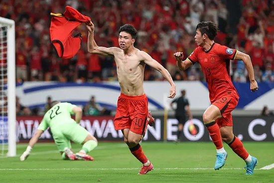 打进个人国家队处子进球后,王钰栋难掩内心激动,在“挣脱”开队友的拥抱后,他脱掉了比赛球衣,随后举起向球迷致意。值得注意的是,在之前身披11号战衣出战后,王钰栋本场比赛披上了象征进攻核心的“10号”。