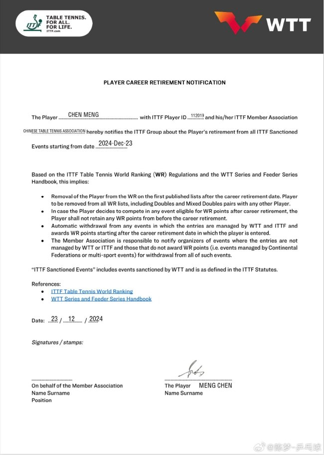 北京时间12月27日下午,继上午樊振东微博宣布退出世界排名之后,宣布巴黎奥运会乒乓球女单冠军得主陈梦同样发微博,退出体无宣布退出世界排名,世界赛事并晒出了向国际乒联提交的排名申请照片。